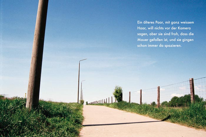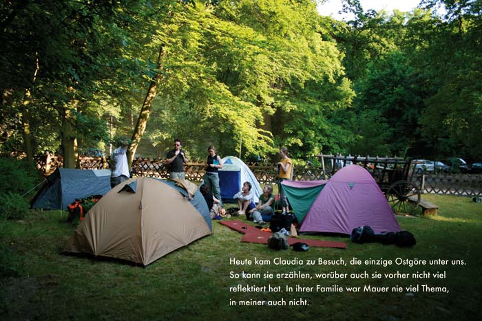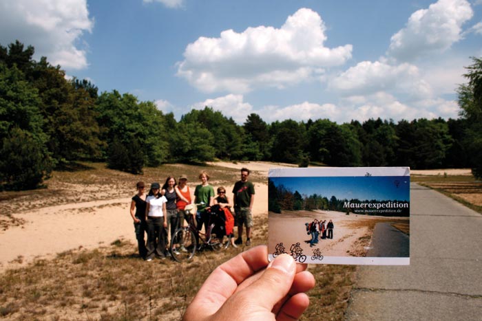 Wir radeln in der Sonne durch den Wald und die Mauer ist nicht mehr da. Sie ist weg. Fast spurlos verschwunden, hat sich in einen Fahhradweg verwandelt. Eine Fahrradautobahn. Pfingstmontag und die Ausflügler stauen sich. Da wo die Mauer war. Es gibt noch Geschichten. Man kann sie hören, wenn man die Menschen auf den Straßen fragt. Sie fließen förmlich aus ihnen heraus. Manchmal zusammen mit ein paar Tränen. Doch nur die älteren erzählen und ich merke, dass ich nicht mehr zu den jungen gehöre. Auch ich habe noch ein paar persönlich erlebte Geschichten zu erzählen. Für die jungen in unserer Gruppe ist da nur mehr der Fahrradweg und ein paar Daten, in der Schule gelernt. Die älteren haben die Mauer in den Köpfen. Als Vorurteil oder als Mahnmal. Ich gehöre zu den letzten der alten, mehr als zu den ersten der jungen. Wir sitzen unter einem Baum, wir diskutieren. Der Unterschied der Systeme, die soziale Marktwirtschaft, das Geld, die Anerkennung. Ein älterer Herr bleibt stehen, mit zwei kleinen Hunden, Hermann und Julchen. Das nächste Interview. Heute der erste Tag, an dem das Thema wichtiger ist als die Gruppe oder der Muskelkater.