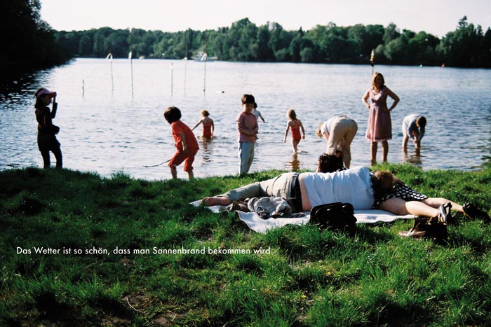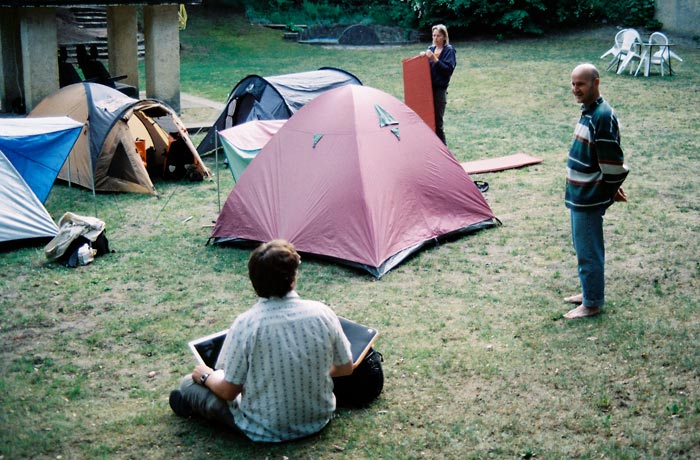 Morgens, 10 Uhr. Ein Flugzeug stört die Ruhe. Flughafen Schönefeld. Die Teilnehmer sitzen verstreut im Garten und führen Tagebuch. Sonne. Ein leichter Wind. Das Geräusch einer Rasensprenganlage. Gänseblümchen auf der Wiese, die Bungalows geräumt, die Fahrräder bepackt. Nächstes Flugzeug. Ein Bus und noch ein Bus in die Gegenrichtung. Sonst kaum Verkehr.