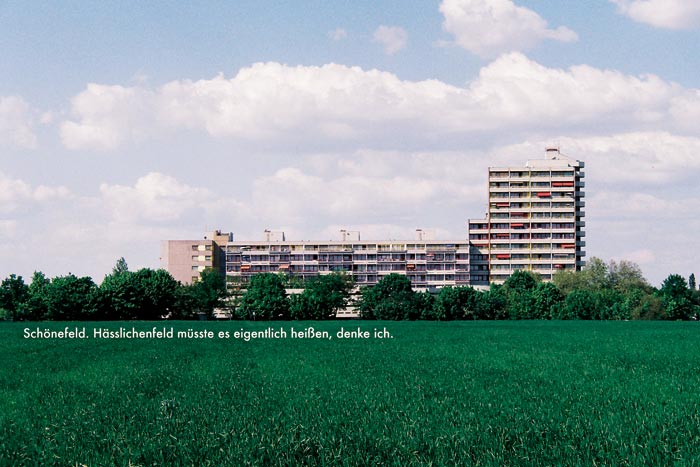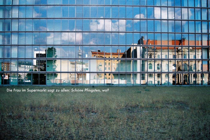 Schönefeld. Hässlichenfeld müsste es eigentlich heißen, denke ich (nur Autobahn und Supermärkte, neu geteerte Straßen, blaue Schilder, Baumärkte;) doch dann geht es wieder auf kleine Dorfstraßen, kurvige Alleen, und eine Siedlung, die aussieht wie in Schweden (wie in Schafwinkel, wie in Schwandorf) und ein weißes Pferd (Araber), das unter sonnendurchschienenen, aber dunklen Bäumen steht und brr macht, dahinter ein Haus aus Holz, eine alte Frau schaut aus dem Fenster heraus. Dann die Straße, die unser Ziel ist (noch 103 Sekunden, ruft Florian), am Haus steht „Zimmer Frei“ gegen den blauen Himmel, die Tannen, dunkle Tannen, dunkle Jägerzeune, erdig, verwuchert Spaghetti essen, abends, auf der Couch (die Frau im Supermarkt sagte zu allen: Schöne Pfingsten, wa?). Alle 10 Minuten Flugzeuge im Tiefflug über unseren Köpfen, jaulende Hunde, nicht gemachte Fotos.
