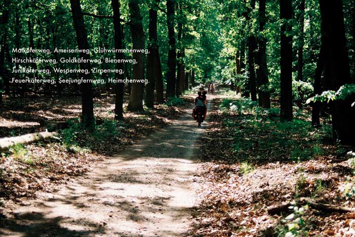 Maikäferweg, Ameisenweg, Glühwürmchenweg, Hirschkäferweg, Goldkäferweg, Bienenweg, Junikäferweg, Wespenweg, Zirpenweg, Feuerkäferweg, Seejungfernweg, Heimchenweg.